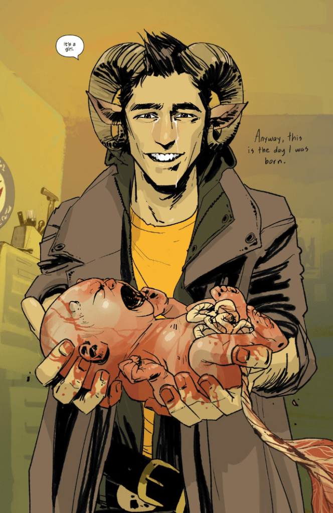 Marko rencontre Alana alors qu’il est prisonnier sur la planète Clivage, elle est alors assignée à la surveillance des prisonniers. Epris l’un de l’autre, ils décident de s’échapper ensemble et le récit s’ouvre sur la naissance de leur fille, Hazel (trop mignonne avec à la fois des cornes et des ailes mais difficile de cacher sa double origine), qui sera le narrateur de l’histoire.