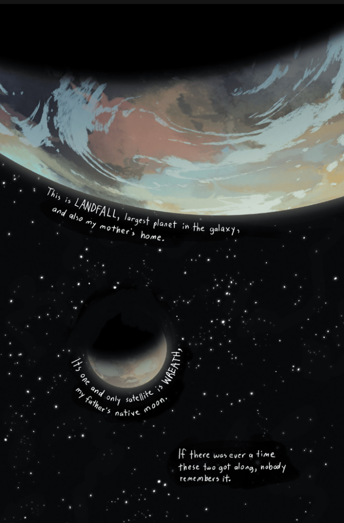 Saga nous conte les aventures de Alana et Marko, sorte de Roméo et Juliette des étoiles. Nos tourtereaux viennent de deux mondes en guerre. Alana vient de Continent, une planète à la technologie hautement avancée. Marko quant à lui vient de l’unique lune de continent, Couronne, dont les habitants manie la magie. Les habitant de Continent ont des ailes, les habitant de Couronne ont des cornes. La destruction de l’un des mondes entrainerait celle de l’autre, de fait les combats sont délocalisés sur d’autres planètes laissant les mondes d’origine des belligérants dans un état de guerre froide forçant les différents peuples à choisir un camp.